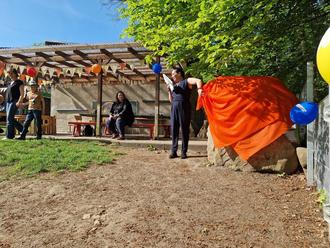 Kita-Leiterin Nancy Osinsky enthüllte den Gedenkstein mit der aufgefrischten Inschrift.