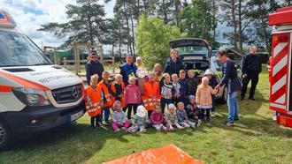 Der Dienstag stand im Zeichen des Blaulichtes. Nach erfolgreicher Brandschutzübung mit Probealarm fuhren Feuerwehr, Polizei und Rettungswagen auf das Kita-Gelände. Die Kinder durften alle Fahrzeuge von innen und außen begutachten, Polizeiwesten anprobieren und Feuerwehrhelme aufsetzen. Sie saßen auf der Krankenliege und bekamen alles detailliert erklärt. Strahlende Kinderaugen winkten zum Abschied, als die Einsatzfahrzeuge mit lautem Tatü-Tata davonfuhren.