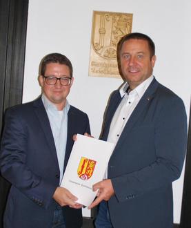 Samtgemeindebürgermeister Arne Behre überreicht Herrn Seebode die Dank- u. Glückwunschurkunde zu seinem 25-jährigem Dienstjubiläum