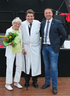 Die besondere Ehrung der beiden ältesten Anwesenden Ingrid Abel (95 Jahre) aus Ebergötzen und Werner Haase (101 Jahre) aus Waake erfolgte zusammen mit „Didi“ im traditionellen weißen Bademantel.