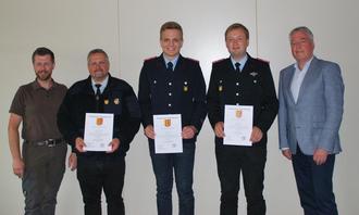 Im Rahmen einer kleinen Feierstunde bedankten sich Gemeindebrandmeister Marcel Hartelt und Verwaltungsvertreter Frank Wilde für das ehrenamtliche Engagement und überreichten die Ernennungsurkunden.