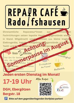 ACHTUNG: Im August ist Sommerpause. Das nächste Repair Café findet am Dienstag den 2. September 2025 von 17-19 Uhr im DGH in Ebergötzen statt. Ein Aufzug ist vorhanden, bitte nutzen Sie die Parkplätze am Festplatz gegenüber.