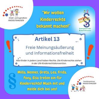 Die UN-Kinderrechtskonventionen sind eine Grundlage der Arbeit des Kinder- und Jugendbüros und des Familienzentrums. Seit 2024 besteht eine Kinderrechtegruppe, die die Kinderrechte auch transparenter in die Öffentlichkeit bringen möchte. Es werden verschiedene Aktionen von der Gruppe zu diesen durchgeführt. Dazu gehört auch die mtl. Veröffentlichung von Kacheln mit einem von den Kindern ausgewählten Kinderrecht.