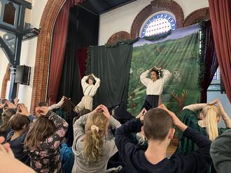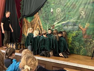 Kurz vor den Weihnachtsferien konnte sich unsere Schule über einen besonderen Höhepunkt freuen – eine kindgerechte Aufführung der Oper Hänsel und Gretel von Engelbert Humperdinck. Im Vorfeld hatten sich alle Klassen im Musikunterricht mit dieser Oper beschäftigt. So wussten die Kinder, dass die Handlung in der Opernfassung ein wenig anderes als in dem bekannten Märchen ist. Hänsel und Gretel werden hier zum Beerenpflücken in den Wald geschickt, nachdem eine von der Nachbarin geschenkte Milchkanne aus Unachtsamkeit verschüttet worden war und es somit keinen Brei zum Abendessen geben konnte, leider aber auch nichts anderes zum Essen vorhanden ist. Als der Vater nach Hause kommt, machen sich die Eltern sofort auf die Suche nach den Geschwistern, denn es wird erzählt, dass sich eine Hexe im Wald aufhalten soll, die Kinder fängt und zu Lebkuchen backt. Hänsel und Gretel bemerken erst zu spät, dass es schon dunkel geworden ist und sie den Weg zurück nicht mehr finden. Daher übernachten sie im Wald. Das Sandmännchen (Liske Witte) und die 8 Waldengelchen beschützen die beiden und das Taumännchen (Joshua Luther) weckt sie am Morgen wieder auf. Diese 10 Rollen durften unsere Schulkinder übernehmen, was sie bravourös erledigten. Auch eine Lehrerin wurde überraschend mit einer Rolle bedacht – ganz ohne Vorbereitung überzeugte Frau Schrot als Mutter von Hänsel und Gretel.