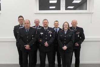 von links nach rechts: stv. Stadtbrandmeister Thomas Gosewehr, Markus Teßner, Friedrich Voigt, Marc Engelmann, Till Scheibner, Siana Busse, Stadtbrandmeister Markus Drewes