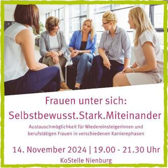 Am 14. November 2024 von 19 – 21 Uhr bietet frau+wirtschaft das Format „Frauen unter sich: Selbstbewusst.Stark.Miteinander“ in den Räumen am Goetheplatz 5a in 31582 Nienburg an.