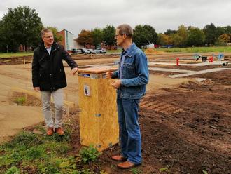 Nun steht er mit Bürgermeister Martin Franke (links) vor den Fundamenten des ersten Mehrfamilienhauses – umringt von Grundschule und Kita, Rathaus und dem Steinhuder Meerbach. Demnächst wird das Haus weiterwachsen.