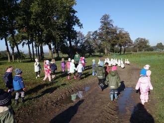 Zum Abschluss halfen die Kinder dabei, die Gänse zur nahegelegen Wiese zu begleiten. Beide Gruppen bildeten für die Gänse einen Gang, damit sie ihren Weg finden, um anschließend alle im „Gänsemarsch“ zur Wiese zu laufen.