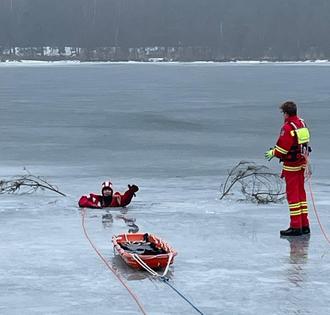 Im ersten Szenario wurde dem „Opfer“ ein Gegenstand zur Selbstrettung zugeworfen – in diesem Fall eine Schleifkorbtrage, die sich gut über das Eis schubsen ließ. Gut festhalten, dann wurde sie ans Ufer gezogen. Im Ernstfall hilft auch Schal, eine Jacke mit ausgebreiteten Ärmeln oder eine Decke – alles, was aus möglichst großer Entfernung mit einem Ende zugeworfen und dann rausgezogen werden kann.