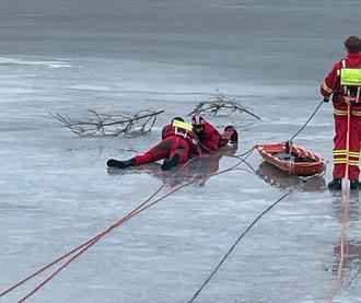 „Findet die Übung am Sonntag statt? Es taut doch schon.“ „Ja, weil es gerade dann am gefährlichsten ist.“ Immerhin, das Eis auf dem Heye-See war noch dick genug, dass die Wasserretter der DLRG Rehburg-Loccum ein Loch hineinsägen mussten, bevor eine Person im Überlebensanzug hineinspringen konnte. Trotzdem waren sie und alle übrigen Personen, die das Eis betreten haben, zur Sicherheit angeseilt.