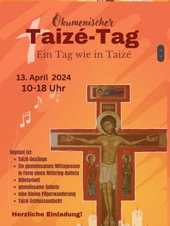 | ab 10 Uhr: | „Ein Tag wie in Taizé“, Beginn im ev. Gemeindehaus, gemeinsames Mittagessen und Pilgerweg, ca. 17 Uhr Abschlussandacht in der kath. Kirche |