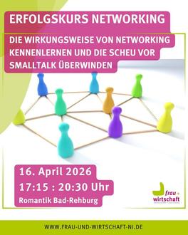Am 16. April 2026 findet von 17.15 bis 20.30 Uhr das Seminar “Erfolgskurs Networking” statt. Die Koordinierungsstelle frau+wirtschaft und Alexandra Schellig, Gleichstellungsbeauftragte der Stadt Rehburg-Loccum, laden gemeinsam zu der Veranstaltung in der Romantik Bad Rehburg, Friedrich-Stolberg-Allee 4 in Rehburg-Loccum ein.