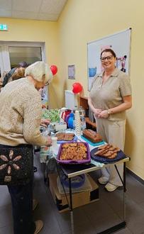 In der Pause wurden Kostproben von den leckeren Kuchen gereicht, deren Rezepte im Buch erwähnt werden. So konnten die Zuhörerinnen und Zuhörer noch besser in die Krimilesung eintauchen. Wie sich der Mordfall aufklärte, wurde nicht verraten, dass sollte das Publikum selber nachlesen. Am Ende der Lesung hatten daher die interessierten Krimi-Leserinnen und Krimi-Leser die Möglichkeit, die Neuauflage der Krimis „Blaubeermorde“ und „Blutroter Flieder“ mit einer persönlichen Widmung von Marion Meister mit nach Hause zu nehmen.