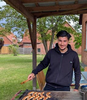 Koray ist mit seinem Bundesfreiwilligendienst in Rehburg-Loccum fast fertig und zeigt sich beim abschließenden gemeinsamen Grillen im Jugendzentrum rundum zufrieden.