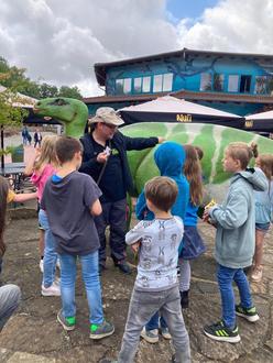 Nach dem Sprung ins kühle Nass wartete schon das nächste Abenteuer, der Dinopark. Dort stand „Jurassic Jens“ bereit, um mit den Nachwuchsforscher_innen auf spannende Entdeckungstouren durch die Urzeit zu gehen.
