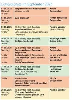Die Kirche ist ab 8:00 Uhr geöffnet. Um 14:00 Uhr sind Sie zu einem Gottesdienst eingeladen, der durch eine Tango-Tanzgruppe begleitet wird. Anschließend können Sie sich im Café Weitblick hinter der Kirche mit Kuchen und Torten, sowie Heiß- und Kaltgetränken stärken. Flyer informieren über die Prinzipalien im Kircheninnenraum. In der Kirche können Sie die drei Kirchspiel-Ortschroniken erwerben. Das Trompeten Ensemble „Duo Simili“ präsentiert um 16:30 Uhr ein einstündiges Konzert und erzählt dabei von stillen Landschaften, großen Gefühlen und fantastischen Welten. Dabei verschmelzen berühmte Filmmelodien mit stimmungsvollen Miniaturen u.a. mit Musik von John Williams und Allen Vizzutti.
