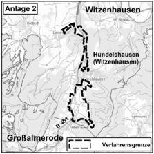 Das Flurbereinigungsgebiet hat eine Größe von 210ha, von denen in der Gemarkung Hundelshausen 171ha, in der Gemarkung Witzenhausen 31ha und in der Gemarkung Dohrenbach 8ha liegen. Es umfasst die im Flurstücksverzeichnis (Anlage 1) aufgeführten Grundstücke. Die Grenzen des Flurbereinigungsgebietes sind auf der Übersichtskarte (Anlage 2) und der Gebietskarte (Anlage 3) mit einer gestrichelten Linie kenntlich gemacht. Die Karten sind keine Bestandteile dieses Beschlusses.