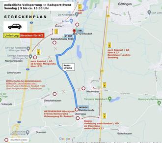 Umleitungsstrecken für Kfz. sind für die Dauer des Radrennens ab Obernjesa und Niedernjesa Richtung Rosdorf sowie von Mengershausen (ab Autobahn-Kreisel) nach Rosdorf eingerichtet.