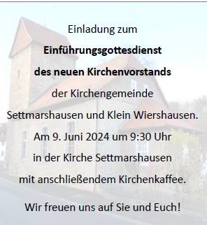 | 09.30 Uhr | Gottesdienst zur Einführung des Kirchenvorstandes in der Kirche zu Settmarshausen mit Pastor i. R. Schulze |
