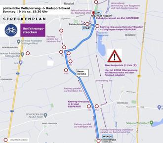 Umleitungsstrecken für Kraftfahrzeuge sind für die Dauer des Radrennens ab Obernjesa und Niedernjesa Richtung Rosdorf sowie von Mengershausen (ab Autobahn-Kreisel) nach Rosdorf eingerichtet.