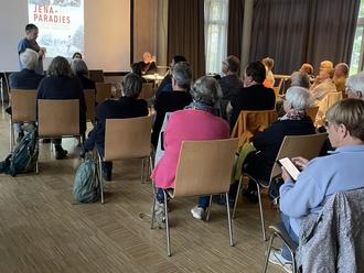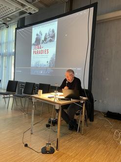 Das Buch ‚Jena-Paradies – Die letzte Reise des Matthias Domaschk‘, das er uns vorgestellt hat, erzählt die Geschichte der DDR-Jugend in den 70er/80er-Jahren und zeigt insbesondere Gemeinsamkeiten mit dem gleichzeitigen Leben der BRD-Jugend auf. Mehrmals unterbrochen hat Wensierski seinen Vortrag, um Bilder aus der Zeit zu zeigen, die mit der Musik von ‚Ton, Steine, Scherben‘ oder von der Band des Matthias Domaschk unterlegt waren. Domaschk und seine Freunde widersetzten sich in Wort und Tat dem Druck und den Repressalien der Gesellschaft und unterliefen so das einschnürende System.
