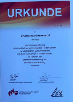 Die Auszeichnung „für vorbildliche Brandschutzerziehung und Brandschutzaufklärung gemeinsam mit den Feuerwehren in Niedersachsen“ wird seit 1990 vom Landesfeuerwehr Verband Niedersachsen verliehen. Die Grundschule Drammetal ist mit die erste Schule im Landkreis Göttingen, die diese Auszeichnung erhält.