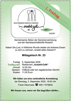 Weiter bietet die Seniorenvertretung gemeinsam mit der Nachbarschaftshilfe den Mittagstisch Nr. 23 nach dem Motto „Mittagessen in geselliger Runde anstelle allein daheim“ im Café Auszeit am Freitag, 5. September, 12:30 Uhr, an. Telefonische Anmeldung bis 2. September unter ( 0551-7079632.