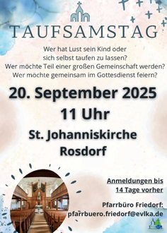| 11 Uhr | Gottesdienst mit dem Kirchenchor, St. Johannis (Vikar Heuer) |
