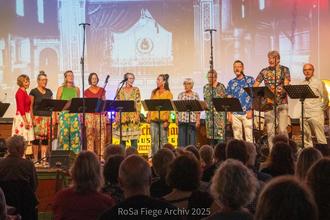 Anschließend eroberte der Frauenchor Rosalie die Bühne. Unter der Leitung von Singer-Songwriterin Karin Bender entführte er das Publikum mit Schwung und Spielfreude auf eine Reise durch verschiedene Klangwelten – von den Beatles bis zu bulgarischen Volksweisen. Der Funke sprang schon beim ersten Song über – mitreißend, lebendig, bunt.