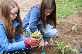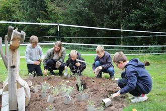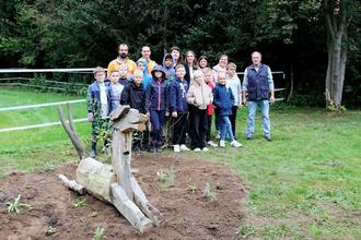 Ausgestattet mit Schaufeln und Spaten halfen die Kinder der 4. Klassen tatkräftig mit, die zahlreichen Pflanzen und Samen in die Erde zu bringen. Andreas Schumann und Toni Schneider vom Bauhof machen es vor. Gepflanzt wurden heimische Sträucher, Stauden und Wildblumen, welche im Vorfeld zusammen mit der BUND Kreisgruppe Göttingen ausgewählt und vom Landkreis Göttingen zu 100 % gefördert wurden. Zu Beginn der Pflanzaktion erklärte Katharina Rorig, Klimaschutzmanagerin der Gemeinde Rosdorf, den Kindern anschaulich, dass das Pflanzen insektenfreundlicher Sträucher und Blumen nicht nur den Insekten, sondern auch dem Klimaschutz zugutekommt: „Pflanzen speichern CO2. Das beutet, je mehr Bäume, Sträucher und Blumen wir hier in der Gemeinde Rosdorf pflanzen, desto mehr CO2 wird aus der Luft herausgefiltert und in den Pflanzen gespeichert.“ In der Grundschule im Drammetal wurden zusätzlich noch selbstgebaute Holztiere in die Fläche integriert, welche den Insekten weiteren Lebensraum bieten und die Fläche optisch aufwerten.