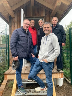Am letzten Tag vor den Herbstferien haben wir mit allen am Bau Beteiligten im Rahmen eines Grillfestes, dass die Firma Würth gesponsert hatte, den Einzug unserer neuen Mitbewohner gefeiert. Dabei wurde das erste gelegte "goldene" Ei aus Friedland Herrn Werner Schirmag aus Rosdorf durch unseren Schüler Julian Sauermann aus Gleichen übergeben. Herr Schirmag war selber Techniklehrer an Schulen in Göttingen und so begeistert von der Hühnerhaus-Idee, dass er schon während des Baus eine großzügige Spende für das erste Ei zusicherte.