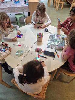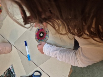 Aus dieser Erfahrung entstand ein wertvoller Impuls: Um zu verhindern, dass weitere Vögel gegen die Fensterscheiben fliegen, gestalteten die Kinder gemeinsam bunte, bemalte DVDs. Diese wurden anschließend von außen an die Fenster gehängt. Durch das Glitzern und die Bewegung der Scheiben können Vögel die Glasflächen besser erkennen und fliegen hoffentlich nicht mehr dagegen.
