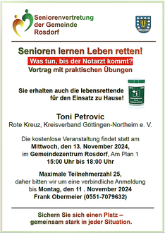 Herr Petrovic vom Roten Kreuz des Kreisverbandes Göttingen-Northeim e. V. wird erläutern, auf was es ankommt. Auch besteht die Möglichkeit, Herz-Lungen-Massage am Dummy zu üben, und es besteht ausreichend Zeit, um Fragen zu stellen.