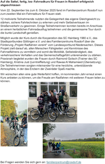 Geschützte Lernumgebung: frauenspezifische Kurse, respektvoller Umgang mit kulturellen Bedürfnissen (z. B. geschlossene Schwimmzeiten, weibliches Lehrpersonal).