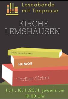 | 19.00 Uhr | Leseabend in der Kirche in Lemshausen. Sie sind herzlich willkommen! |