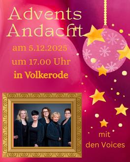 | 17.00 Uhr | Adventsandacht mit den Voices in der Kirche in Volkerode (Lekt. Conrady) |