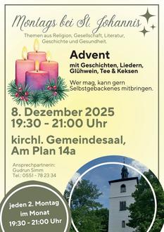 Montags bei St. Johannis, 2. Montag im Monat, 19:30 Uhr (8.12)