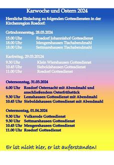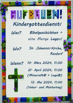 | 11.00 Uhr | Gottesdienst m. Vorstellung der Konfirmanden (parallel Kindergottesdienst) |
