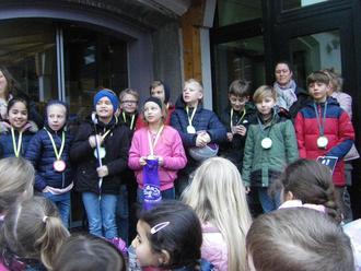 Am nächsten Schultag gab es noch eine Überraschung: Vor Unterrichtsbeginn wurden wir von der gesamten Schulgemeinschaft empfangen und mit selbst gebastelten Medaillen bedacht.