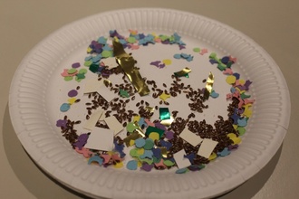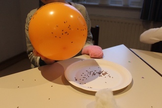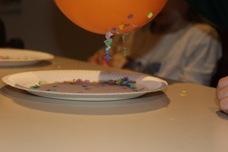 Teller gefüllt mit Konfetti, Aluminiumstückchen und Leinsamen. Mit einem Socken oder Wolle wird über den aufgeblasenen Ballon gerubbelt und dieser dann über den Teller gehalten. Was passiert?