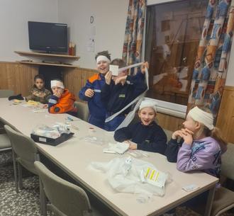 Florian Wenzel vom DRK übernahm den Dienst und vermittelte grundlegende Maßnahmen der Ersten Hilfe. Dabei übten wir unter anderem das Anlegen von Verbänden und den richtigen Umgang mit Pflastern.
