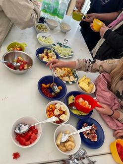 Erstmal wurde gerätselt, um welche Obstsorten es sich handelt. Woher sie ursprünglich kommen, was man daraus machen kann. Und woher die Kinder sie kennen könnten, sofern sie diese noch nicht gesehen haben. Dann durften die Kinder das Obst putzen, schälen, schneiden und einen Obstsalat daraus machen. An dem warmen Tag und bei dem herrlichen Wetter eine richtig tolle Sache. Zehn Kinder und Jugendliche, sowie vier Erwachsene hatten viel Spaß und großen Appetit.