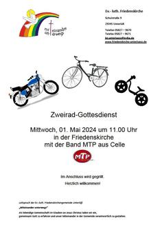| 01.05.2024 | Zweirad- gottesdienst | Pastor Günther | Musik: Band MTP + M. Bahr |