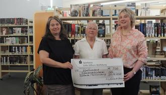 Silke Wachsmuth-Uhrner, Vorsitzende der Bibliotheksgesellschaft, übergab während der Feierstunde im Beisein von Bürgermeisterin Katharina Ebeling einen Spendenscheck für außerplanmäßige Anschaffungen an Kersti Henning, die Büchereileiterin.