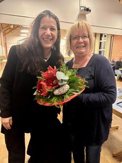 Samtgemeindebürgermeisterin Claudia Sommer gratuliert Monika Wendt mit einem Blumenstrauß zur Wiederwahl