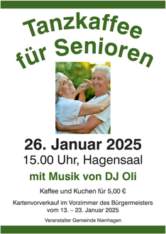 Viele werden sagen: "ENDLICH" endlich wird in Nienhagen wieder getanzt. Wie versprochen, setzt die Gemeinde Nienhagen dieses Event für die älteren aber jung gebliebenen Bürger und Bürgerinnen und Freunde des TanzKaffees aus der Samtgemeinde und dem Landkreis Celle fort. Für Paare und Singles, denn bei guter Musik kommt man ja bekanntlich schnell ins Gespräch!