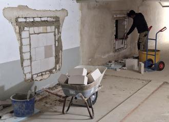 Die beauftragte Rohbaufirma hat im Kellergeschoss damit gestartet, Mauerdurchbrüche von ehemaligen Lüftungskanälen und Rohrdurchführungen zu verschließen. Diese Arbeiten sind erforderlich, um den Brandschutzauflagen nachzukommen, nachdem die alten Lüftungsleitungen im Frühjahr bereits demontiert wurden.