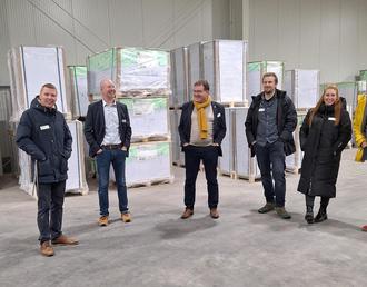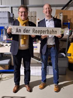 Bürgermeister Harms bedankte sich bei Achim und Christoph Rodenberg für die umfangreiche Präsentation ihres Betriebes und überreichte als Dankeschön eine Künstler-Handzeichnung des Rathauses an die beiden Herren.