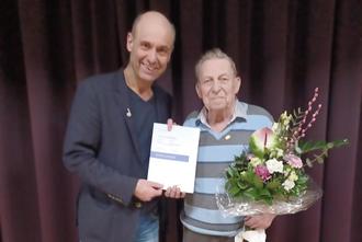 70 Jahre Chor, Matthias Blazek (links) gratuliert Adolf Wiegmann