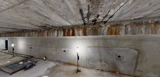 Kellerdecke mit Betonabplatzungen und korrodiertem Bewehrungsstahl im Bereich der Überlaufrinne.